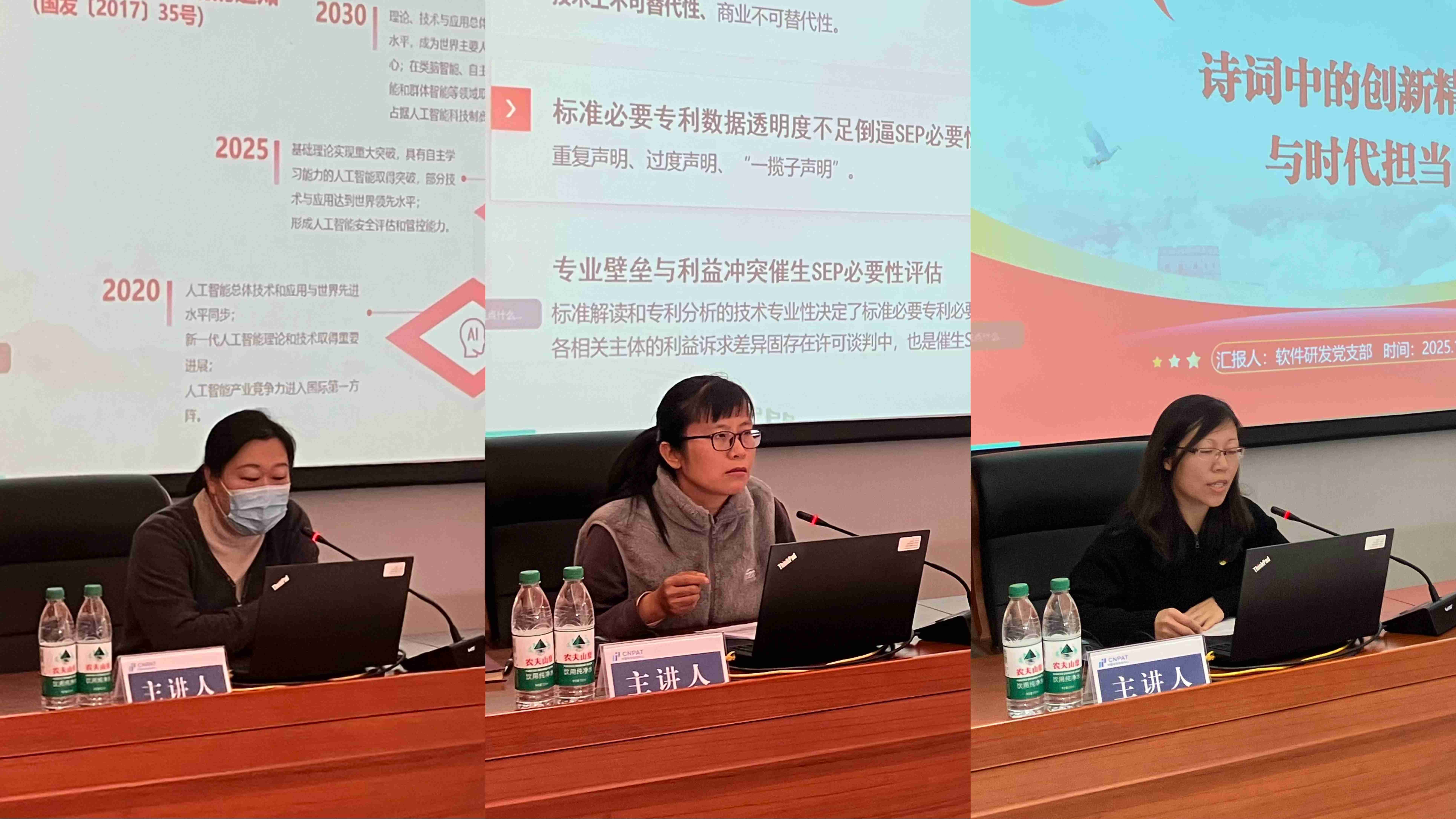 讲堂活动中,国专党支部雷静同志以“政策引导与技术变革双重驱动的国专数智化应用探索”为题,紧扣“十五五”规划等相关政策与知识产权领域新技术应用趋势,详细阐述了国专公司在数字化与AI智能化方面的落地实践。信息加工处党支部孙丽伟同志以“四中全会精神引领下的标准必要专利知识与实践党课”为题,结合领域热点话题与政策导向,系统解读了标准必要专利的内涵、价值与发展现状。软件研发党支部张雪同志以“诗词中的创新精神与时代担当”为题,将传统文化与全会精神、科技创新要求相结合,诠释了新时代党员干部应有的创新勇气与责任担当。